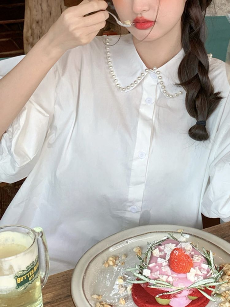 [CD428]와이드 퍼프 진주 뒤트임 블라우스