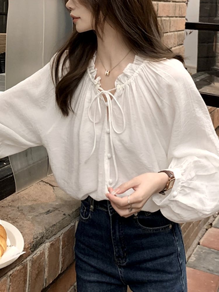 [CD868]무디 셔링 콩단추 벌룬 블라우스