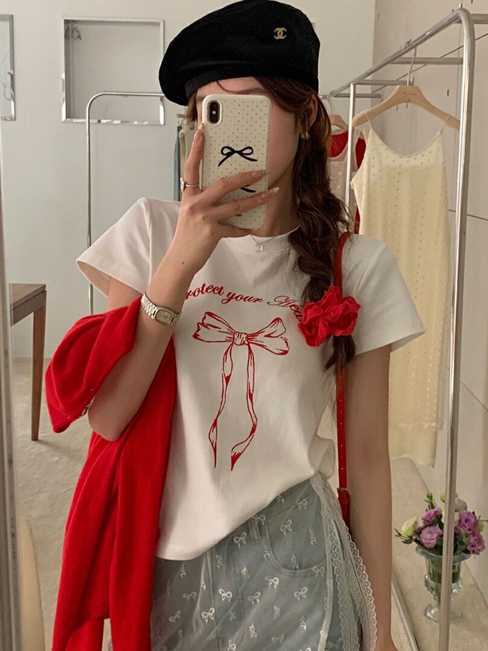 [DE350]리본 보우 프린팅 반팔티셔츠