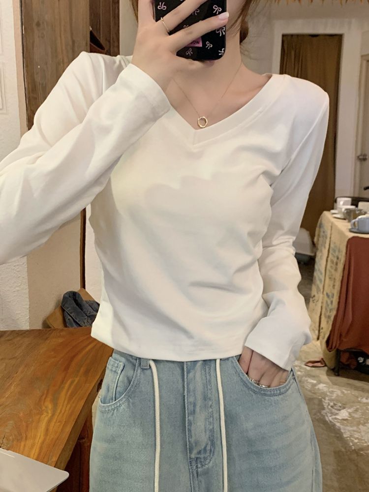 [DE761]피즈 브이넥 세미크롭 긴팔티셔츠