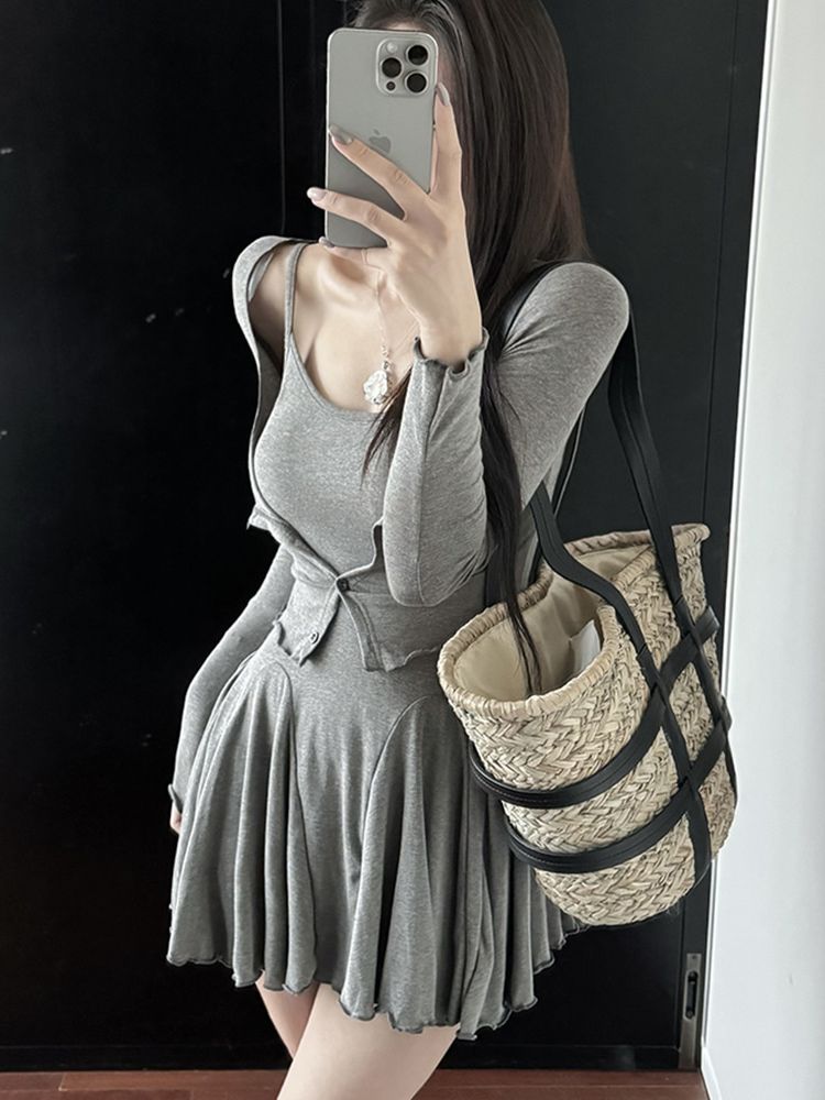 [DE624]엘씨 플리츠 미니원피스+가디건세트